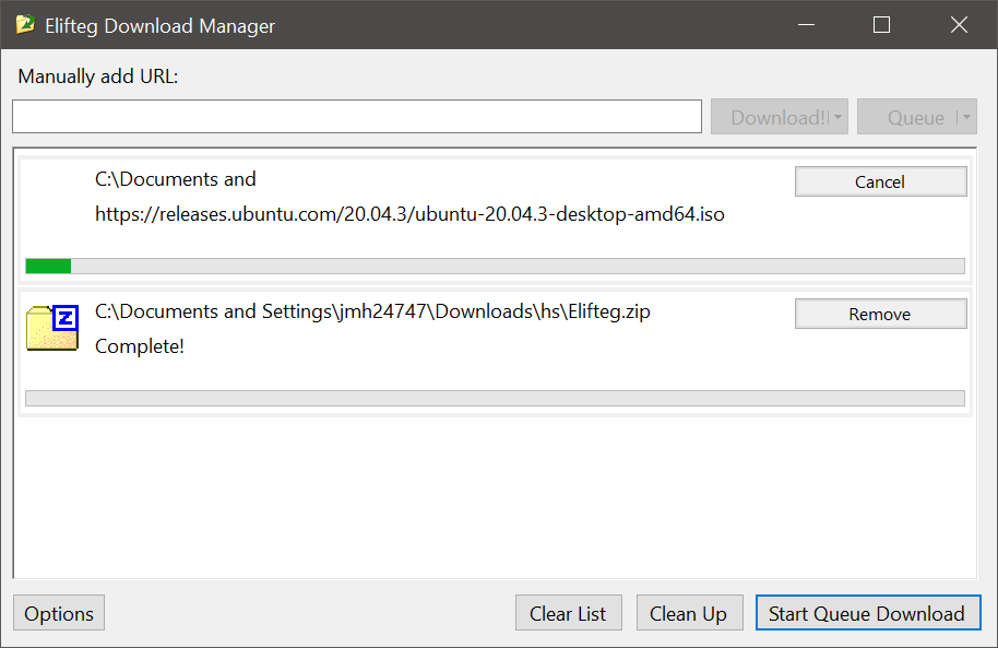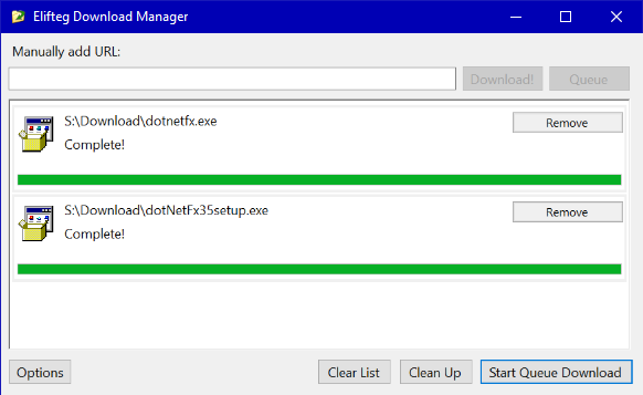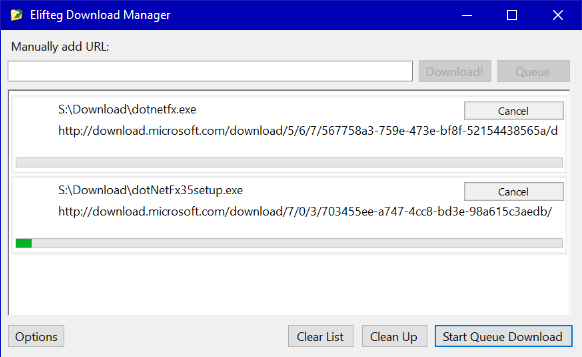 Elifteg is a simple download manager that allows you to queue up file and download them in order, or simultaneously. It currently supports the http/https protocol for file transfers. Due to being built on the .NET 3.5 framework, you will need a special patch to support modern TLS 1.2 and TLS 1.3 websites if using https. It is a bare-minimum application that was designed for a fast way to rip a ton of files without having to click and save each one. Some of its current features include: