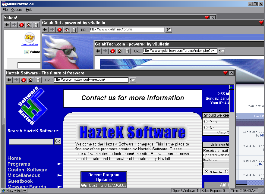 HazteK MultiBrowse was created for people that browse web forums. It lets you load two or more pages at once, that way you can drag links from one browser window into another, and never have to use the back and forward buttons. It works like a normal browser, based on the Internet Explorer engine. It’s not the world’s most innovative program, but it sure is helpful.