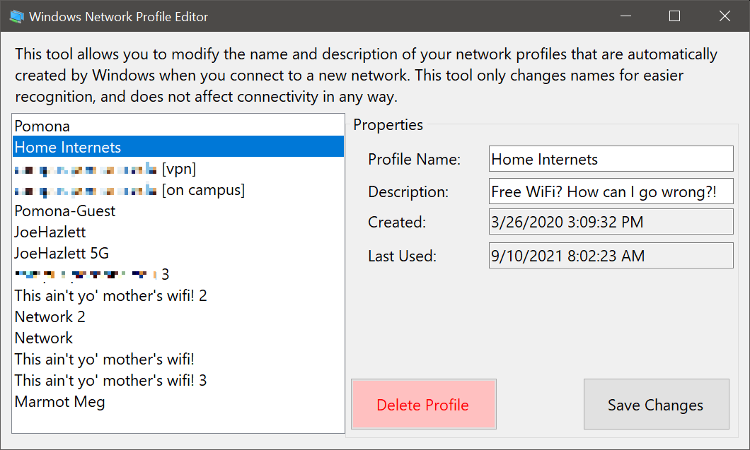 If you ever wondered if it was possible to change how your WiFi or wired connection shows up when you click the network icon in the Windows system tray, this tool is for you. Since these labels are literally just used for identification by humans, making changes to these profiles makes sense. While it is possible to do this without using a tool such as Network Profile Editor, Windows does not provide a way to do so easily. It requires digging through the registry to make those changes.