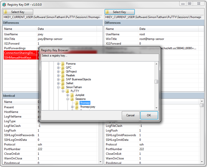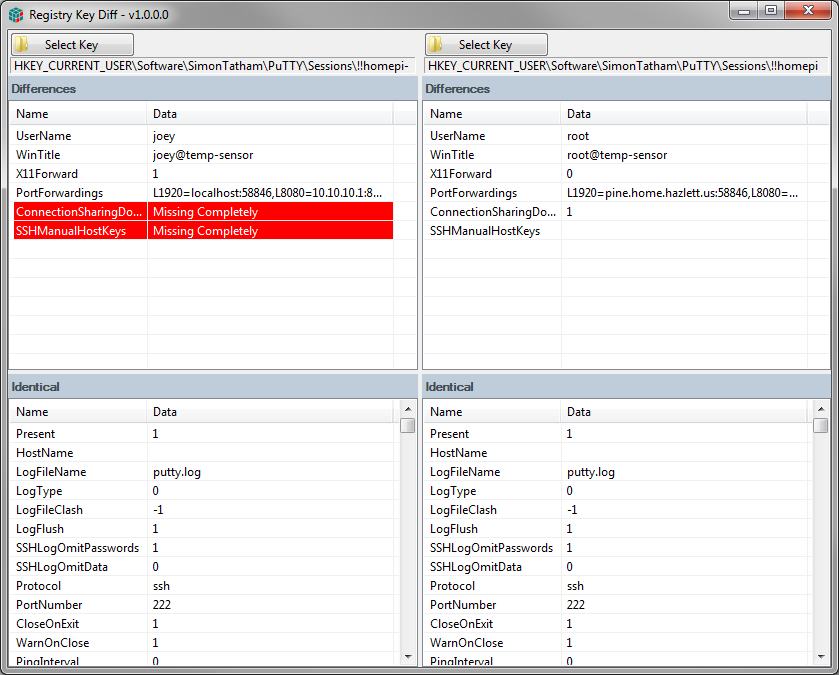 Registry Key Diff is a tool to allow you to compare two different local registry keys to see what is the same and what is different about them. It was created to compare PuTTY sessions to see why one session acts differently than an almost identical one.