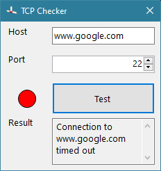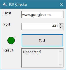 TCP Checker is a simple tool to allow you test whether a TCP connection can be made between the system it is running on and a host somewhere else on a network. It can be used to troubleshoot whether a port may be blocked by a firewall or routing rule.