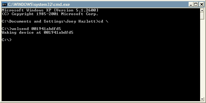 WOLSend is a simple command-line utility for waking devices up (specifically computers) when you send a “magic” packet out to the network.