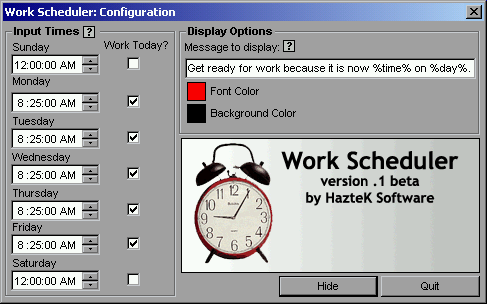 Work Scheduler allows you to input your schedule for the upcoming week and as long as the program is running in your system tray, it will remind you when you need to be at work. If you are the type of person that has to rush last minute because you hit snooze on your alarm clock too many times, or you were busy browsing the ‘net instead of getting ready for work, then this program is for you! Some options this program features are listed below: